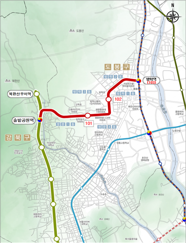 우이신설 연장선은 현재 운영 중인 우이신설선 솔밭공원역과 1호선 방학역을 연결하는 사업으로 총 연장 3.94㎞ 정거장 3개소가 신설된다.