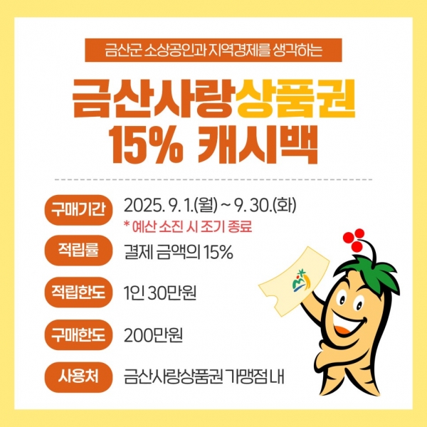 [충청뉴스큐] 금산군은 금산사랑상품권 9월 캐시백 적립률을 기존 10%에서 15%로 확대 적용하고 있다고 밝혔다.
