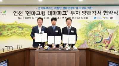 이재명 경기도지사와 김광철 연천군수, 김태형 ㈜더츠굿 대표는 7일 오후 연천군청 상황실에서 이런 내용을 담은 ‘덴마크 테마파크 조성 투자 양해각서’에 서명했다.