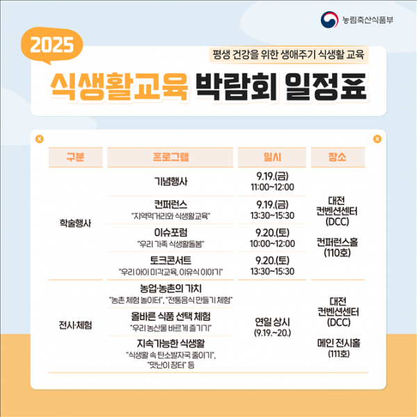 [충청뉴스큐] 농림축산식품부는 식생활에 대한 국민적 관심을 높이고자 9월 19일부터 20일까지 이틀간 대전컨벤션센터에서 ‘2025 식생활교육 박람회’를 개최한다.