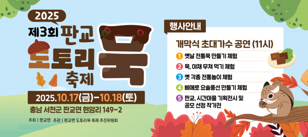 [충청뉴스큐] 서천군 판교면은 오는 10월 17일부터 18일까지 이틀간 판교전통시장 일원에서 ‘제3회 판교 도토리묵 축제’를 개최한다.