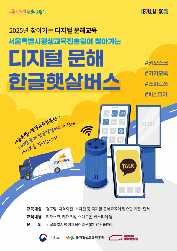 교육 내용은 키오스크 사용법, 스마트폰·카카오톡 활용, AI스피커 활용 등이며 경로당·지역회관·복지관 등 디지털 문해교육이 필요한 기관과 학습자를 대상으로 운영한다.