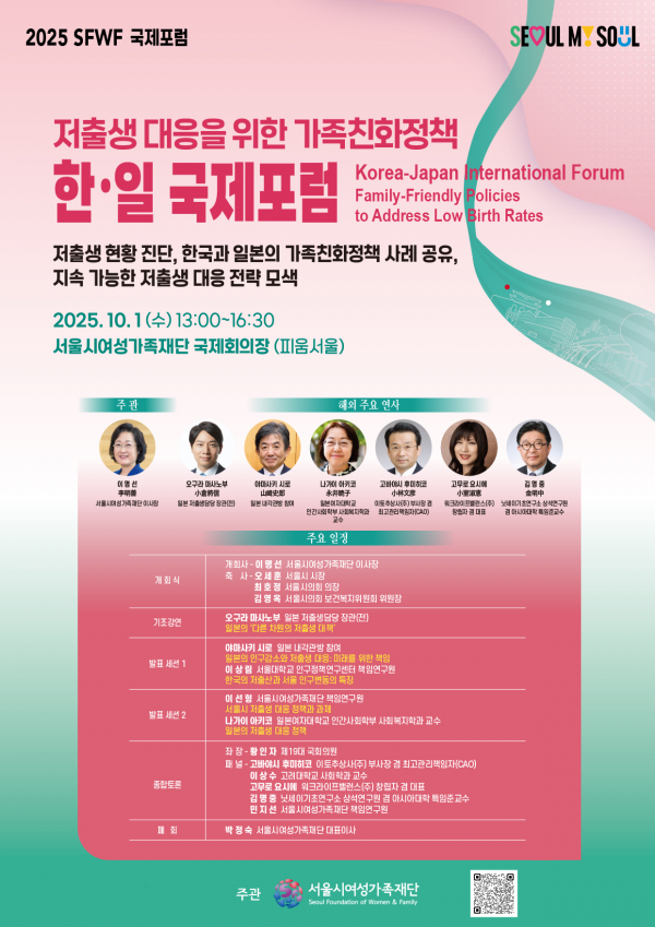 [충청뉴스큐] 서울시여성가족재단은 오는 10월 1일 오후 1시부터 4시 30분까지 서울여성플라자 국제회의장에서 ‘저출생 대응을 위한 가족친화정책 한·일 국제포럼’을 개최한다고 밝혔다.