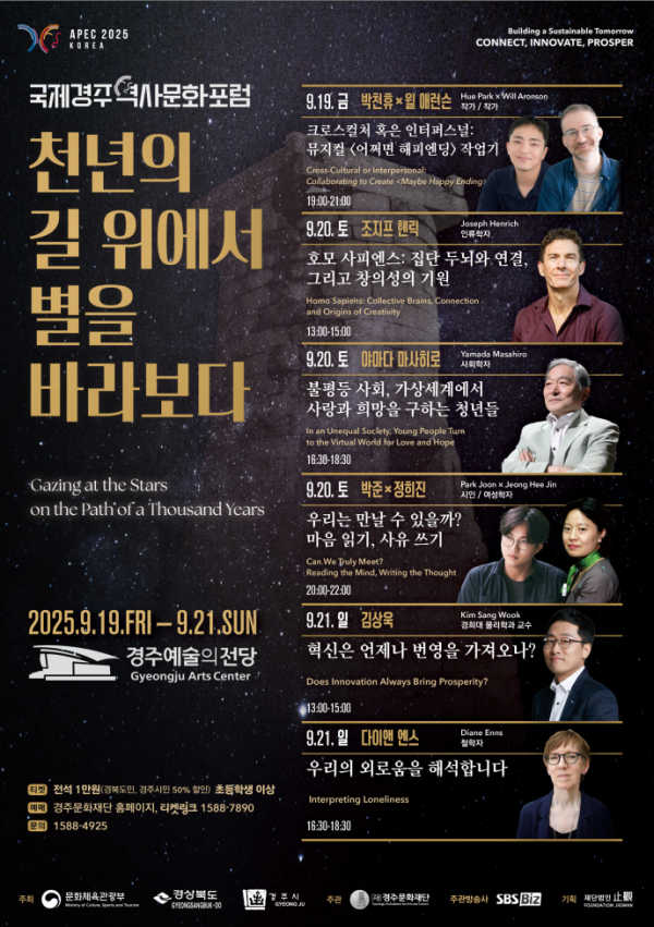 세계역사문화도시 경주의 천년 인문 정신과 세계 인문학을 연결하는 이번 포럼은 ‘천년의 길 위에서 별을 바라보다’를 주제로 인류가 함께 모색해야 할 지속 가능한 미래에 대해 인문학적으로 접근하는 국제포럼으로 ‘APEC 2025 KOREA’ 3대 의제인 ‘연결’, ‘혁신’, ‘번영’을 바탕으로 한 6개 세션으로 구성된다.