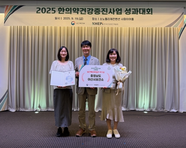 [충청뉴스큐] 아산시는 19일 서울 강남구 소노펠리체 컨벤션에서 열린 ‘2025년 한의약건강증진사업 성과대회’에서 보건복지부 장관상을 수상했다고 밝혔다.