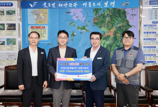 [충청뉴스큐] 보령시는 지난 22일 시청 시장실에서 김동일 보령시장과 황보석수 한전산업개발㈜ 보령사업처 행정실장 등 관계자가 참석한 가운데 추석 명절 맞이 후원물품 전달식을 가졌다고 밝혔다.