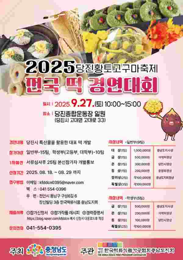 [충청뉴스큐] 당진시는 오는 27일 오전 10시 50분부터 오후 3시까지 당진종합운동장 일원에서 ‘2025년 전국 떡 경연대회’를 개최한다고 24일 밝혔다.