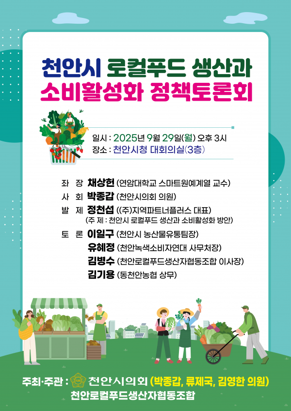 [충청뉴스큐] 천안시의회와 천안로컬푸드생산자협동조합은 오는 9월 29일 오후 3시, 천안시청 대회의실에서 중소 가족농과 지역 먹거리 순환체계 구축을 위한 ‘천안시 로컬푸드 생산과 소비 활성화’ 정책토론회를 공동으로 개최할 예정이다.