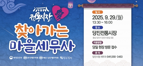 [충청뉴스큐] 당진시는 예산당진세무사회와 협업해 오는 9월 29일 오후 1시 30분부터 4시까지 당진전통시장 어시장 광장 앞에서 추석 명절을 맞아 ‘전통시장愛 찾아가는 마을세무사’ 행사를 운영한다고 25일 밝혔다.