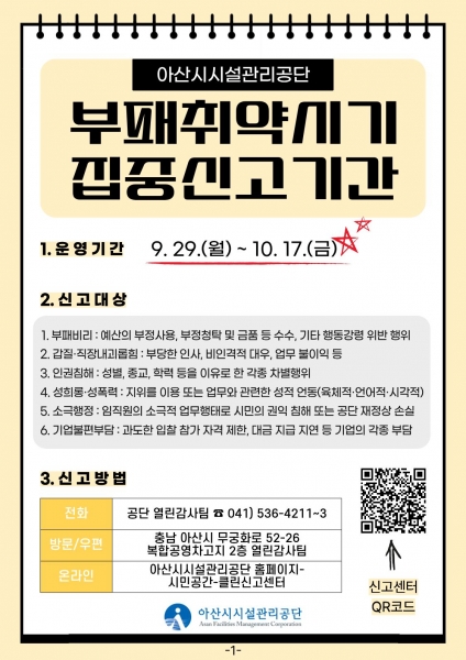 [충청뉴스큐] 아산시시설관리공단은 추석 명절을 맞아 복무기강 확립 및 청렴도 향상을 위해 오는 29일부터 10월 17일까지 부패취약시기 집중신고기간을 운영한다.
