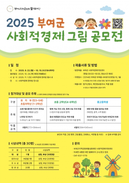 [충청뉴스큐] 부여군지역공동체활성화재단 사회적경제지원센터는 관내 어린이와 청소년을 대상으로 ‘2025 사회적경제 그림 공모전’을 개최한다고 밝혔다.