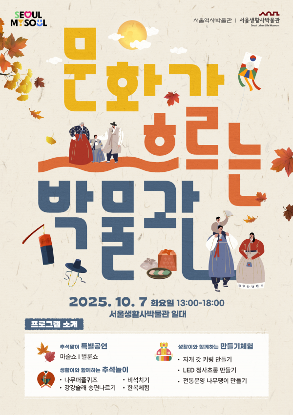 [충청뉴스큐] 서울역사박물관은 오는 7일 오후 1시부터 6시까지 분관인 서울생활사박물관에서 ‘추석맞이 문화행사‘문화가 흐르는 박물관’’를 개최한다.