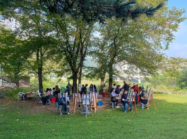 연수에 참여한 돌봄전담사들은 야외 자연환경 속에서 이젤을 펼치고 캔버스에 직접 그림을 그리는 실습 중심 프로그램에 참여했다.