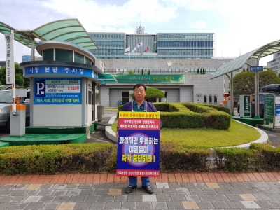 [충청뉴스큐] 수원전투비행장 화성이전반대 범시민대책위원회가 수원군공항의 화성 이전을 전제로 한 민간공항 여론조사를 강력히 규탄하기 위해 수원시청 앞에서 1인 시위에 돌입했다.