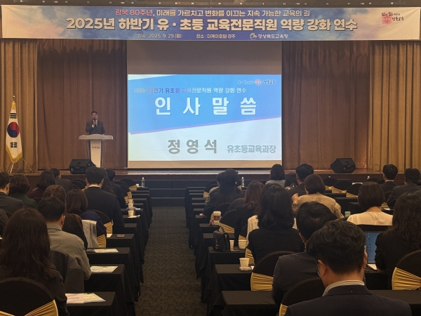[충청뉴스큐] 경북교육청은 29일 경주시에 있는 더케이호텔경주에서 본청과 직속기관·교육지원청 소속 유·초등 교육전문직원 160여명이 참석한 가운데 ‘2025 하반기 유·초등 교육전문직원 역량 강화 연수’를 개최했다고 밝혔다.