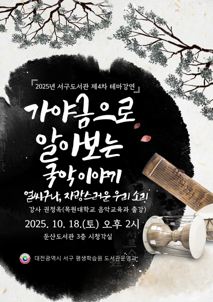 [충청뉴스큐] 대전 서구는 관내 도서관에서 10월 한 달간 국악을 주제로 한 ‘테마 도서 전시 및 강연’을 운영한다.
