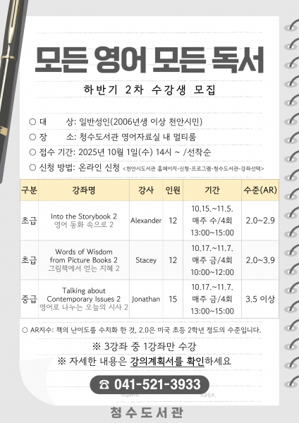 [충청뉴스큐] 천안시 청수도서관은 내일 1일부터 성인 영어 프로그램 ‘모든 영어 모든 독서’ 수강생을 모집한다고 30일 밝혔다.