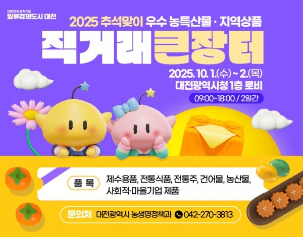 [충청뉴스큐] 대전시는 추석 명절을 맞아 10월 1일부터 2일까지 시청 1층 로비에서 ‘우수 농·특산물 및 지역상품 직거래 큰장터’를 운영한다.