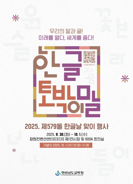 행사는 ‘우리의 말과 글 미래를 열다, 세계를 품다’를 주제로 제579돌 한글날과 광복 80주년의 역사적 의미를 함께 되새기며 경남이 하나 되는 한글 문화 축제로 펼쳐진다.