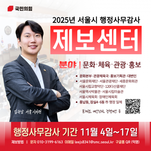 [충청뉴스큐] 김규남 서울시의원은 오는 11월 4일부터 17일까지 열리는 2025년도 서울시 행정사무감사를 앞두고 시민 참여를 위한 제보센터를 운영한다고 30일 밝혔다.
