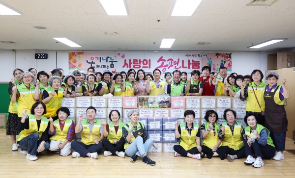 이날 봉사자 50여명은 정성스럽게 준비한 송편과 식료품 세트를 포장해 동 행정복지센터를 통해 관내 소외계층 300여 세대에 전달했다.
