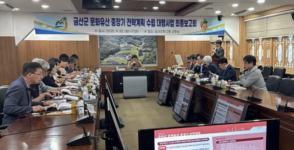 [충청뉴스큐] 금산군은 9월 30일 군청 상황실에서 금산군 문화유산 중장기 전략계획 수립 연구용역 최종보고회를 개최했다.