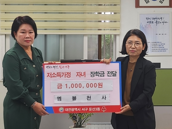 [충청뉴스큐] 대전 서구 둔산3동 행정복지센터는 엠블천사 장학회로부터 저소득 청소년을 위한 장학금 100만원을 후원받았다고 2일 전했다.