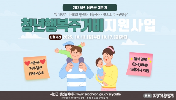 [충청뉴스큐] 서천군이 오는 13일부터 17일까지 3분기 청년 행복 주거비를 신청·접수 받는다.