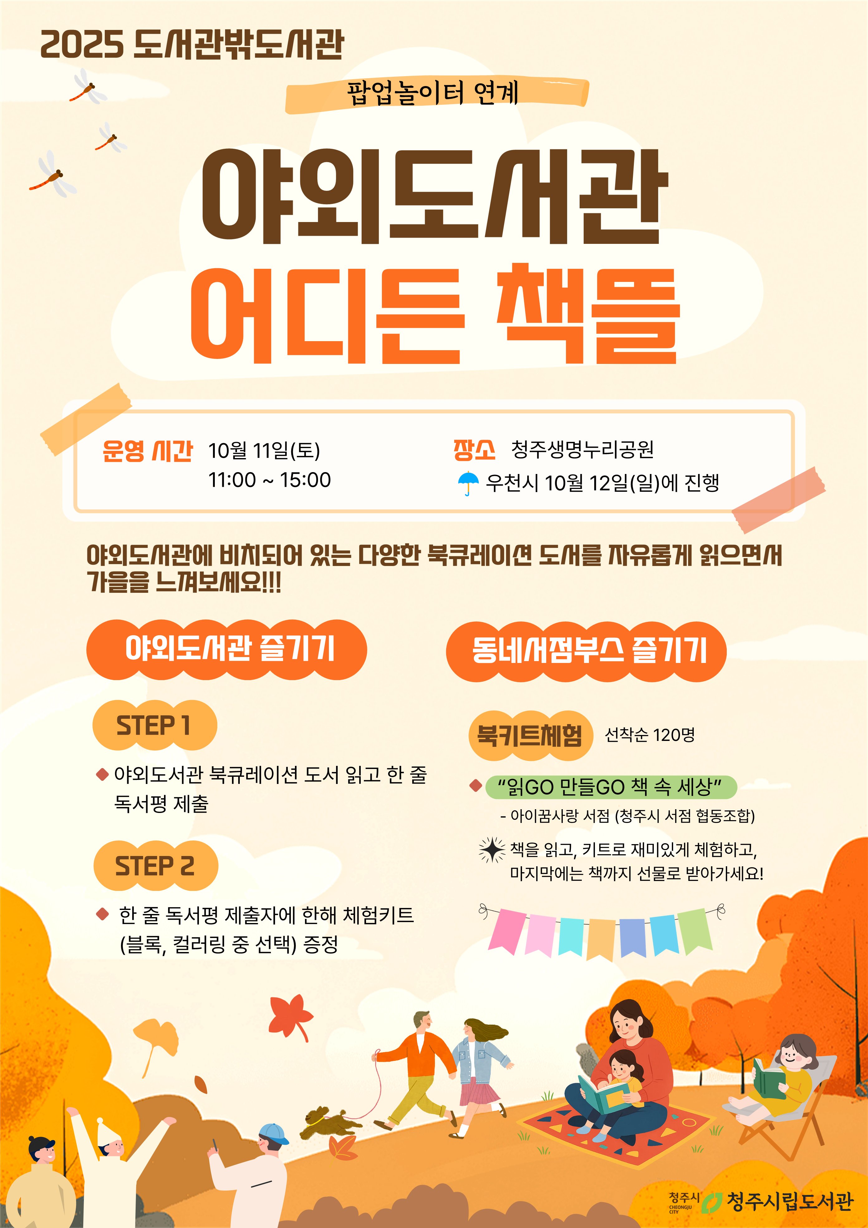 [충청뉴스큐] 청주시립도서관은 오는 11일 오전 11시부터 오후 3시까지 생명누리공원 일원에서 2025년 팝업놀이터와 연계해 ‘도서관밖도서관’을 운영한다.