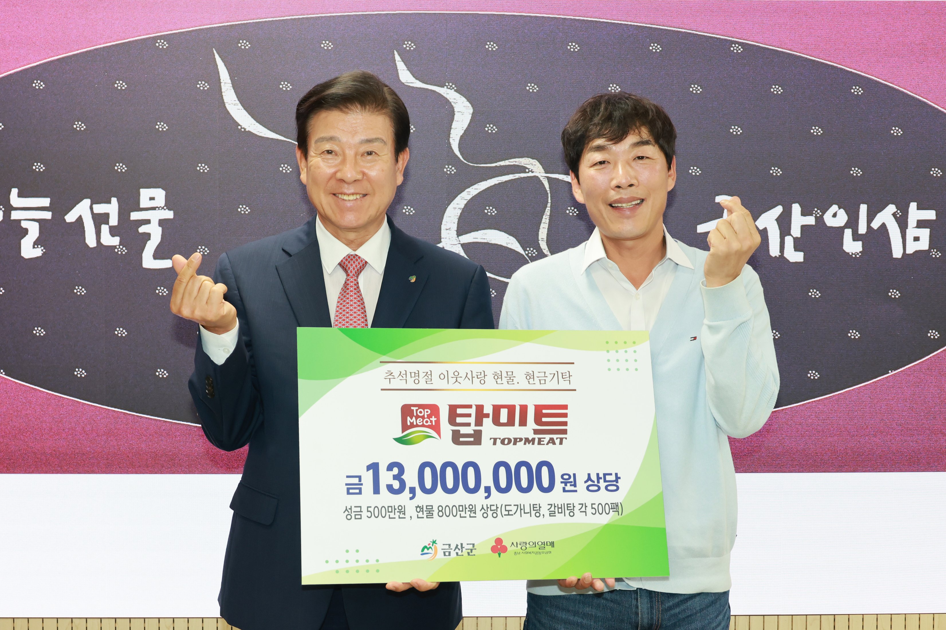 [충청뉴스큐] 프리미엄 육가공 전문업체 탑미트(대표 권동욱)는 지난 2일 금산군을 찾아 총 1300만 원 상당의 현금 및 현물 기탁식을 개최했다.
