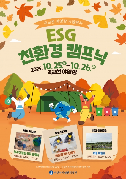[충청뉴스큐] 아산시시설관리공단은 오는 10월 25일부터 26일까지 이틀간 곡교천 야영장에서 ‘ESG 친환경 캠프닉’ 행사를 개최한다고 밝혔다.