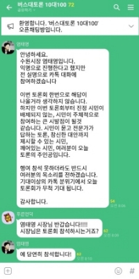 [충청뉴스큐] 수원시가 ‘버스 문제 해법 모색을 위한 대토론회’에 앞서 개설한 카카오톡 오픈채팅방 ‘버스대토론 10대 100’의 시민 참여 열기가 토론회 시작 전부터 뜨겁게 달아오르고 있다.