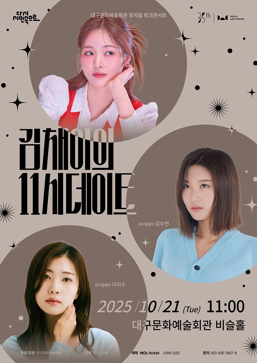 [충청뉴스큐] 대구문화예술회관이 선보이는 뮤지컬 토크 콘서트 ‘김채이의 11시 데이트’ 가 오는 10월 21일(화) 오전 11시, 대구문화예술회관 비슬홀에서 열린다.