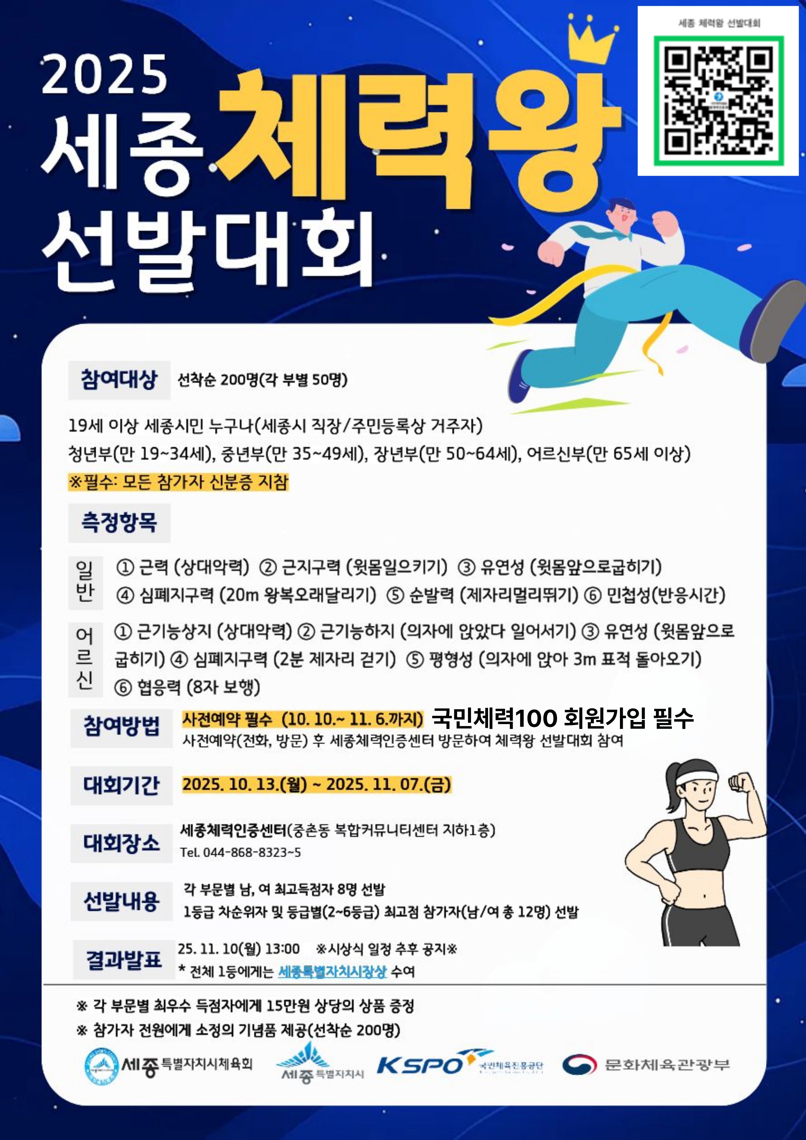 [충청뉴스큐] 세종시체육회(회장 오영철)는 시민의 건강증진과 생활체육 참여 확대를 위해 국민체육진흥공단 및 세종시의 재정 후원을 받아‘2025년 세종 체력왕 선발대회’를 오는 10월 13일부터 11월 7일까지 개최한다.