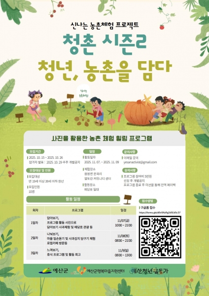 [충청뉴스큐] 예산군행복마을지원센터는 청년과 농촌이 함께 어우러지는 교류 프로그램 ‘청촌 시즌2’ 참가자를 오는 10월 26일까지 모집한다고 밝혔다.