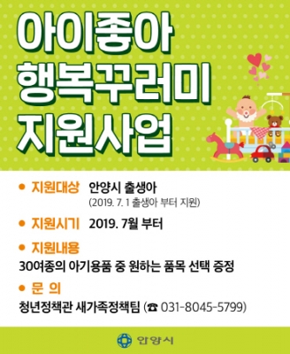 안양시가 아이 낳아 키우기 좋은 도시 시책 일환으로 다음달부터 ‘아이좋아 행복꾸러미 지원사업’을 확대 실시한다고 지난 11일 밝혔다.