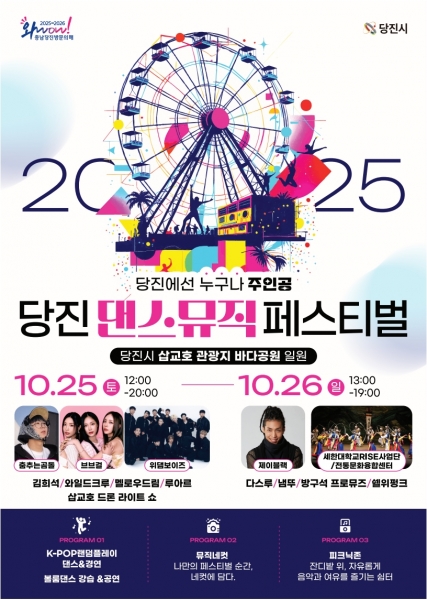 [충청뉴스큐] 당진시가 오는 25일과 26일 이틀간 삽교호 관광지 바다공원 일원에서 ‘2025년 당진 댄스&뮤직 페스티벌’을 개최하며 '춤과 음악으로 하나 되는 당진, 당진에선 누구나 주인공'이라는 주제로 화려한 가을 축제의 장을 펼친다.