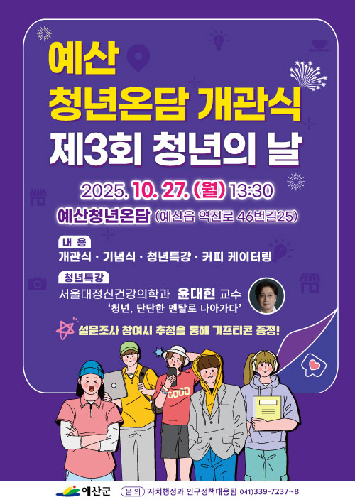 [충청뉴스큐] 예산군은 오는 10월 27일 오후 1시 30분, 예산읍 주교리에 위치한 청년거점공간 ‘예산청년온담’에서 개관식과 제3회 청년의 날 기념행사를 개최한다고 밝혔다.