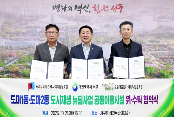 [충청뉴스큐] 대전 서구는 도마1동 도마실마을관리 사회적협동조합 및 도마2동 도솔마을관리 사회적협동조합과 ‘도마1·2동 도시재생 공동이용시설 운영 민간 위탁 협약’을 체결했다고 22일 전했다.