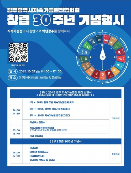 정현윤 기후환경국장은 “광주지속가능발전협의회 30주년 기념행사는 광주시가 지속가능한 미래를 향한 의지를 다지는 중요한 자리”며 “많은 시민들이 관심을 갖고 적극 참여해 주길 바란다”고 말했다.