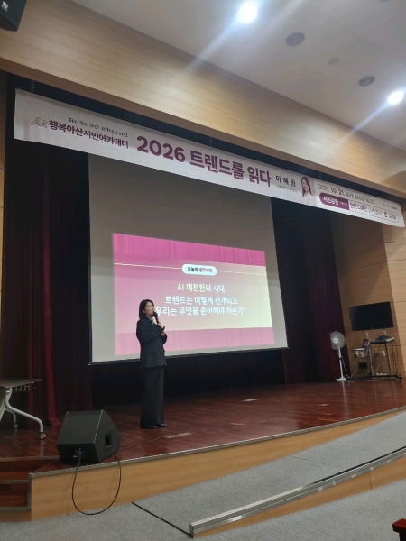 [충청뉴스큐] 아산시는 21일 배방읍 행정복지센터 다목적홀에서 ‘행복아산 시민아카데미’ 다섯 번째 강연으로 이혜원 교수의 ‘2026 트렌드를 읽다’ 특강을 개최했다고 밝혔다.