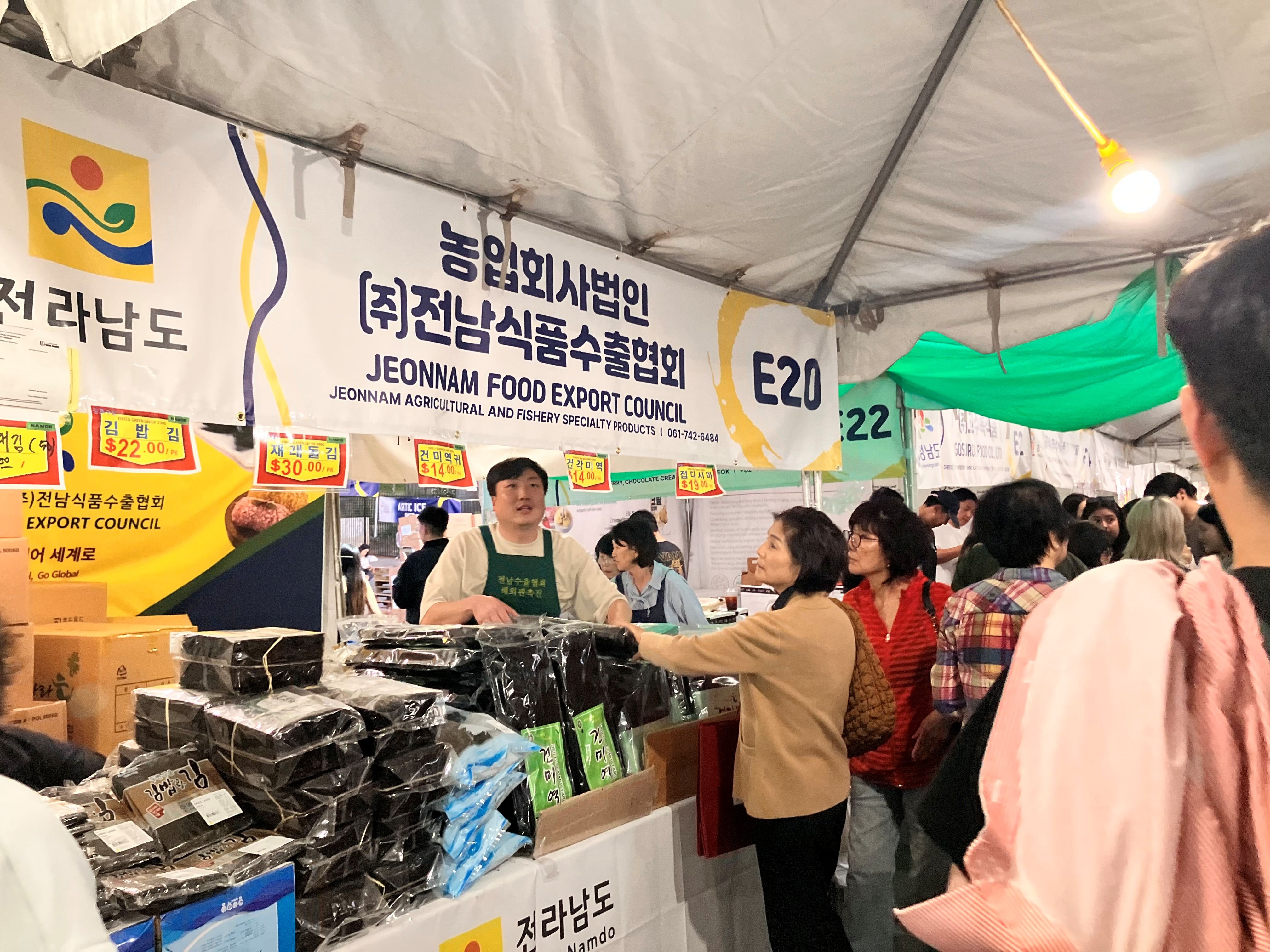 이번 축제에선 전남 대표 수출품목인 김을 비롯해 김치, 된장·고추장 등 전통장류, 표고 녹차, 한과, 식혜, 건어물·젓갈·전복 등 수산물까지 다양한 품목을 판매했으며 대부분의 제품이 현지 소비자로부터 큰 인기를 얻었다.