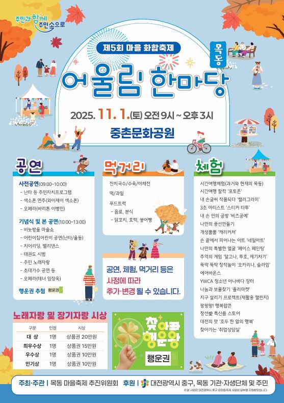 [충청뉴스큐] 대전 중구 목동은 오는 11월 1일 중촌문화공원에서 ‘2025년 제5회 목동 어울림 한마당 축제’를 개최한다고 밝혔다.