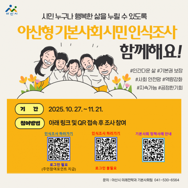 오세현 아산시장은 “시민 참여와 민주주의는 기본사회의 핵심 가치이자 출발점”이라며 “시민 의견이 폭넓게 반영되어 체감할 수 있는 정책 설계가 이루어지도록 이번 조사에 적극적인 참여를 바란다”고 말했다.