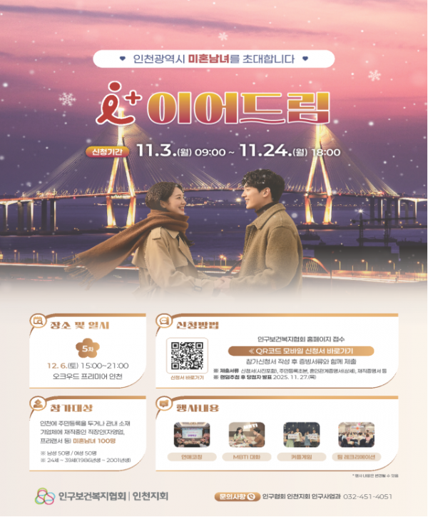 시현정 시 여성가족국장은 “연말을 앞두고 많은 인천 청년들이 참여해 소중한 인연을 맺는 활기찬 만남의 장이 되길 기대한다”고 말했다.