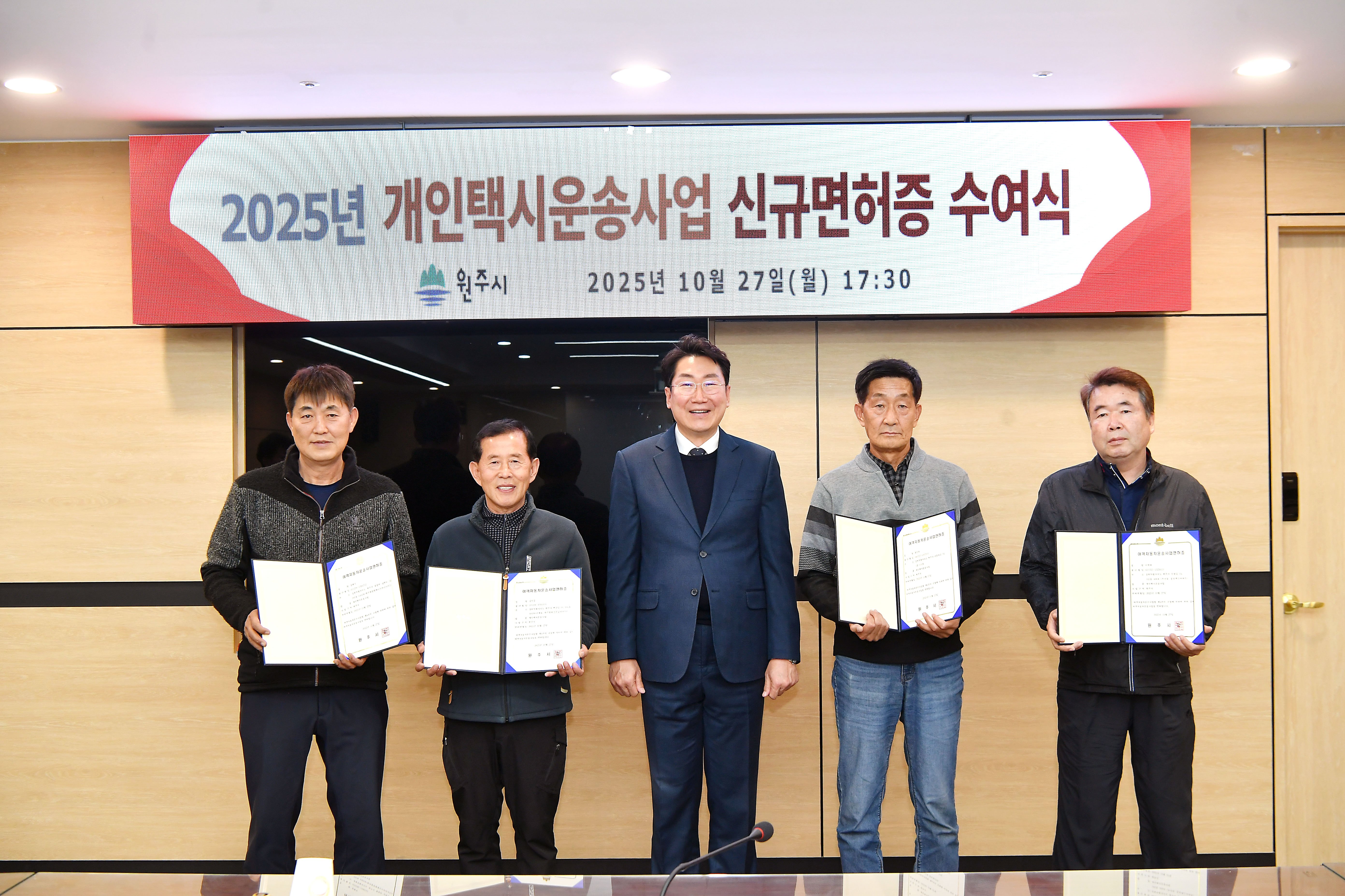 [충청뉴스큐] 원주시는 2025년 개인택시운송사업 신규 면허 대상자 4명을 확정· 발표하고 이달 27일 시청 7층 회의실에서 개인택시 운송사업 신규 면허증 수여식을 개최했다.