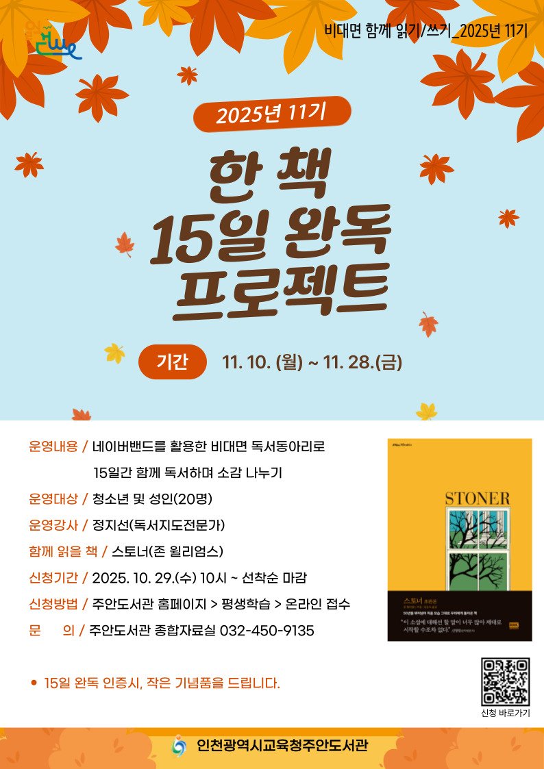 [충청뉴스큐] 인천광역시교육청주안도서관(관장 최문정)은 10월 29일(수) 오전 10시부터 ‘2025년 11기 비대면 함께 읽기–한 책 15일 완독 프로젝트’참가자를 모집한다.
