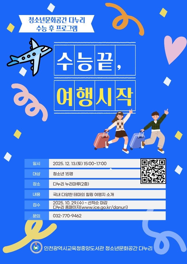 [충청뉴스큐] 인천광역시교육청중앙도서관(관장 곽미혜) 청소년문화공간 다누리는 수능을 마친 고3 수험생과 청소년들의 심리적 안정과 자기돌봄을 돕기 위해 ‘2025년 수능 후 프로그램’을 11월 15일(토)과 12월 13일(토) 두 차례 운영한다.
