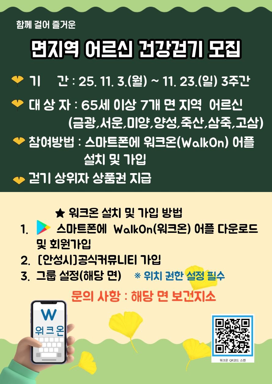 [충청뉴스큐] 안성시 관내 7개 보건지소(금광,서운,미양,양성,일죽,죽산,고삼)는 오는 11월 3일부터 23일까지 65세 이상 어르신을 대상으로 건강 걷기 사업 '청춘길도 한걸음부터'를 실시한다고 밝혔다.