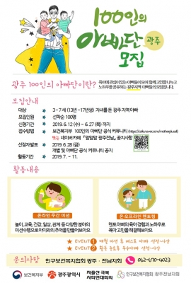 보건복지부 100인의 아빠단 공식 커뮤니티 사이트의 ‘광주지역게시판’ 또는 네이버카페 ‘맘맘맘 광주전남’ 공지사항을 통해 신청서를 제출하면 된다. 선정된 참여자는 28일 개별공지하고, 보건복지부 커뮤니티에 게시할 예정이다.